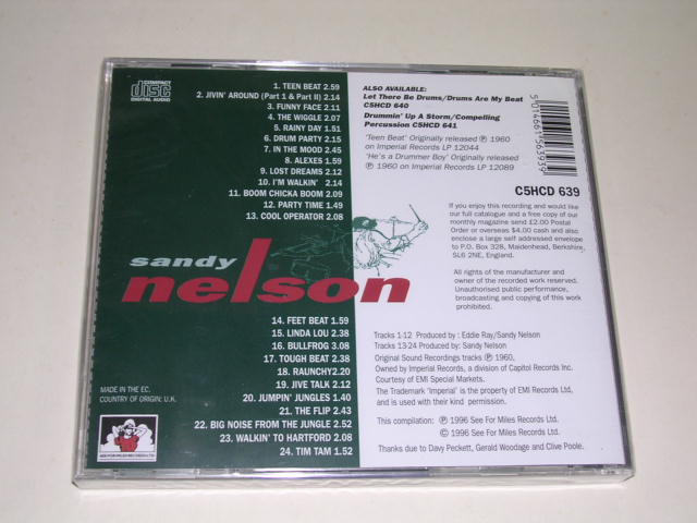 ※サイト内のすべての画像のコピー・無断転用を禁止しています。個人・法人様のサイト(ブログ・HP・掲示板等)でのご紹介で使用されたい場合は前もってご連絡下さい ARTIST : SANDY NELSON TITLE : PLAYS TEEN BEAT + HE'S A DRUMMER BOY ( 2 in 1 ) LABEL : SEE FOR MILES CONDITION JACKET DISK SEALED SEALED No. : C5HCD-639 OTHERS : RELEASE YEAR : 1996 COUNTRY : UK OUT-OF-PRINT