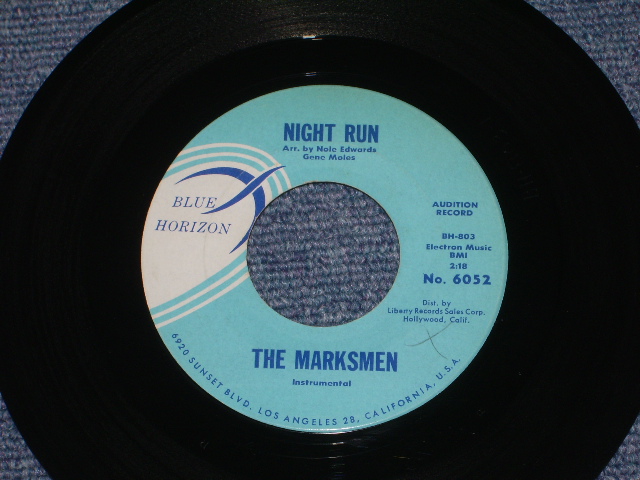 ※サイト内のすべての画像のコピー・無断転用を禁止しています。個人・法人様のサイト(ブログ・HP・掲示板等)でのご紹介で使用されたい場合は前もってご連絡下さい ARTIST : THE MARKSMEN NOKIE EDWARDS & DON WILSON? of THE VENTURES TITLE : A) NIGHT RUN B) SCRATCH LABEL : BLUE HORIZON CONDITION JACKET DISK never have A) Ex+++ B) Ex++ SMALL WRITING ON LABEL No. : NO.6052 OTHERS : RELEASE YEAR : 1960 ??? COUNTRY : US 1960 US ORIGINAL PROMO 7"45's Single VERY HARD TO FIND now Matrix # HAND WRITING STYLE SIDE-A : BH-803 A1 SIDE-B : BH-804 A ※サイト内のすべての画像のコピー・無断転用を禁止しています。 個人・法人様のサイト(ブログ・HP・掲示板等)でのご紹介で使用されたい場合は前もってご連絡下さい