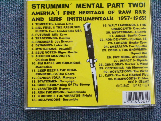 ※サイト内のすべての画像のコピー・無断転用を禁止しています。個人・法人様のサイト(ブログ・HP・掲示板等)でのご紹介で使用されたい場合は前もってご連絡下さい ARTIST : V.A. OMNUBUS TITLE : STRUMMIN MENTAL PART TWO LABEL : CRYPT CONDITION JACKET DISK MINT- MINT No. : CR-CD-LR602 OTHERS : RELEASE YEAR : COUNTRY : GERMANY USED CD