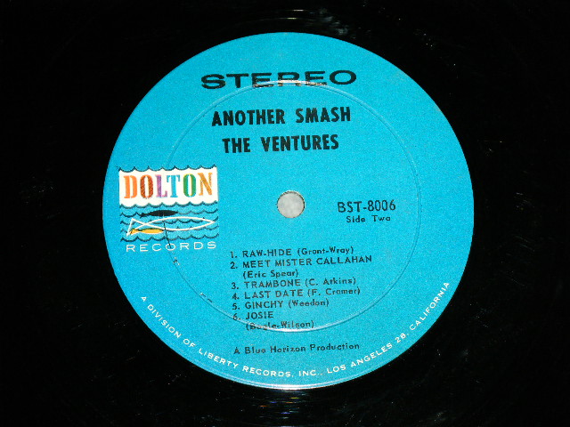 ※サイト内のすべての画像のコピー・無断転用を禁止しています。個人・法人様のサイト(ブログ・HP・掲示板等)でのご紹介で使用されたい場合は前もってご連絡下さい ARTIST : THE VENTURESTITLE : ANOTHER SMASH 2nd Issued "SILHOUETTE COVER" LABEL : DOLTON CONDITIONJACKETDISKFC) Ex++BC) Ex MINT- DAMAGED AT BACK COVER No. : BST-8006 STEREPO OTHERS : RELEASE YEAR : COUNTRY : 1963? Version US AMERICA "BLUE with BLACK PRINT Label" STEREO Used LP 2nd Issued "SILHOUETTE COVER" Matrix # : TYPING STYLE A) BST 8006 -1 B) BST 8006-2 ※サイト内のすべての画像のコピー・無断転用を禁止しています。 個人・法人様のサイト(ブログ・HP・掲示板等)でのご紹介で使用されたい場合は前もってご連絡下さい