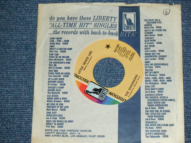 | ARTIST : | THE SHANNONS ( PRODUCED by MEL TAYLOR of The VENTURES ) | | TITLE : | A) LITTLE WHITE LIE ( SMALL SIZE THIN TITLE LOGO ) B) ARE YOU SINCERE | | LABEL : | LIBERTY | | CONDITION | | JACKET | DISK | | never have | A) MINT B) MINT | | | No. : | 56100 | | OTHERS : | RELEASE YEAR : COUNTRY : 1968 US ORIGINAL 7"45's Single MEL'S PRODUCED WORKS | ※サイト内のすべての画像のコピー・無断転用を禁止しています。 個人・法人様のサイト(ブログ・HP・掲示板等)でのご紹介で使用されたい場合は前もってご連絡下さい |