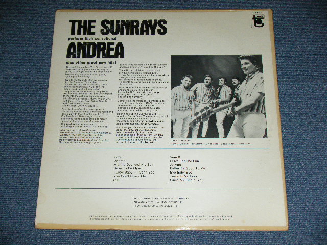 | ARTIST : | The SUNRAYS | | TITLE : | ANDREA | | LABEL : | TOWER | | CONDITION | | JACKET | DISK | | Ex | Ex+++ Looks: Ex++ | EDGE SPLIT AT BOTTOM 6cm and TAPE SEAM ON ROUND EDGE SIDE VERY FEW VERY SMALL SURFACE HAIRLINES | | No. : | T-5017 MONO | | OTHERS : | RELEASE YEAR : COUNTRY : 1966 US ORIGINAL MONO LP MATRIX NUMBER A) T1-5017-F1 B) T2-5017-F1 MURRY WILSON of THE BEACH BOYS' BRIAN BROTHERS' FATHER | ※サイト内のすべての画像のコピー・無断転用を禁止しています。 個人・法人様のサイト(ブログ・HP・掲示板等)でのご紹介で使用されたい場合は前もってご連絡下さい  |
