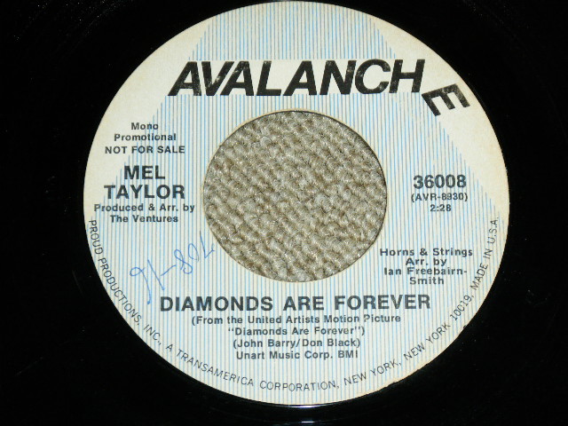 | ARTIST : | MEL TAYLOR ( of The VENTURES' DRUMMER ) | | TITLE : | A) DIAMOND ARE FOREVER B) DIAMOND ARE FOREVER | | LABEL : | AVALANCHE | | CONDITION | | JACKET | DISK | | never have | A) Ex- Looks: Ex+ B) Ex- Lookks : Ex+ | WRITING ON LABEL | | No. : | 36008 | | OTHERS : | RELEASE YEAR : COUNTRY : 1970's US ORIGINAL 7"45's Single PROMO ONLY SAME FLIP !!!! SOLO | ※サイト内のすべての画像のコピー・無断転用を禁止しています。 個人・法人様のサイト(ブログ・HP・掲示板等)でのご紹介で使用されたい場合は前もってご連絡下さい |